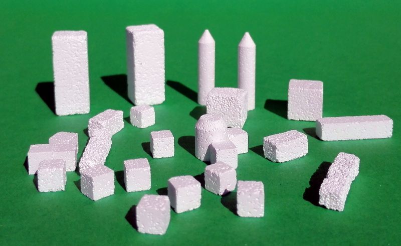 Bloczki i kostki o różnych wielkościach i kształtach, pakowane oddzielnie w sterylnym opakowaniu. Produkt jest gotowy do bezpośredniego użycia.