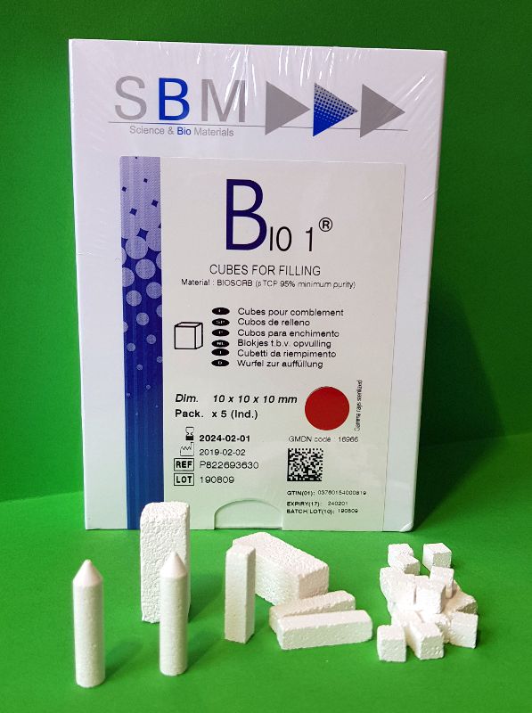 BIO-1 bloczki i kostki to w 100% syntetyczny substytut kości zbudowany na bazie czystego β-TCP, w formie sześcianów różnej wielkości. Porowatość (45% ± 5%) na wskazanym poziomie sprzyja intensywnej regeneracji kości, przy zachowaniu optymalnej wytrzymałości mechanicznej.